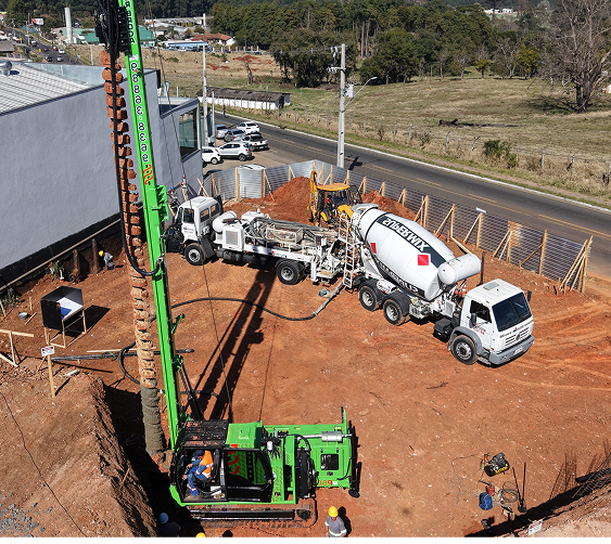 Ao concluir a perfuração, inicia-se o processo de concretagem da estaca. O trado helicoidal possui um tubo central vazado, por onde o concreto é bombeado. À medida que o trado vai sendo retirado do solo, o concreto é injetado continuamente sob pressão operação controlada pelo operador da perfuratriz garantindo o completo preenchimento do fuste e evitando falhas, vazios ou formação de bolhas.