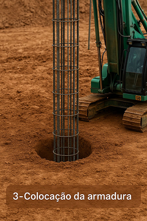 Após a conclusão da concretagem, a armadura em formato de gaiola é posicionada dentro da estaca, podendo ser inserida manualmente ou com auxílio de equipamento adequado.